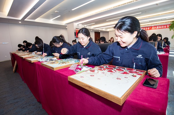平日里忙碌于键盘间的“玫瑰”们,此刻化身为专注细腻的“生活艺术家”,或凝神构思,或左右交流,小心翼翼地用镊子夹起珍珠,沿着图案轮廓精心勾勒。
